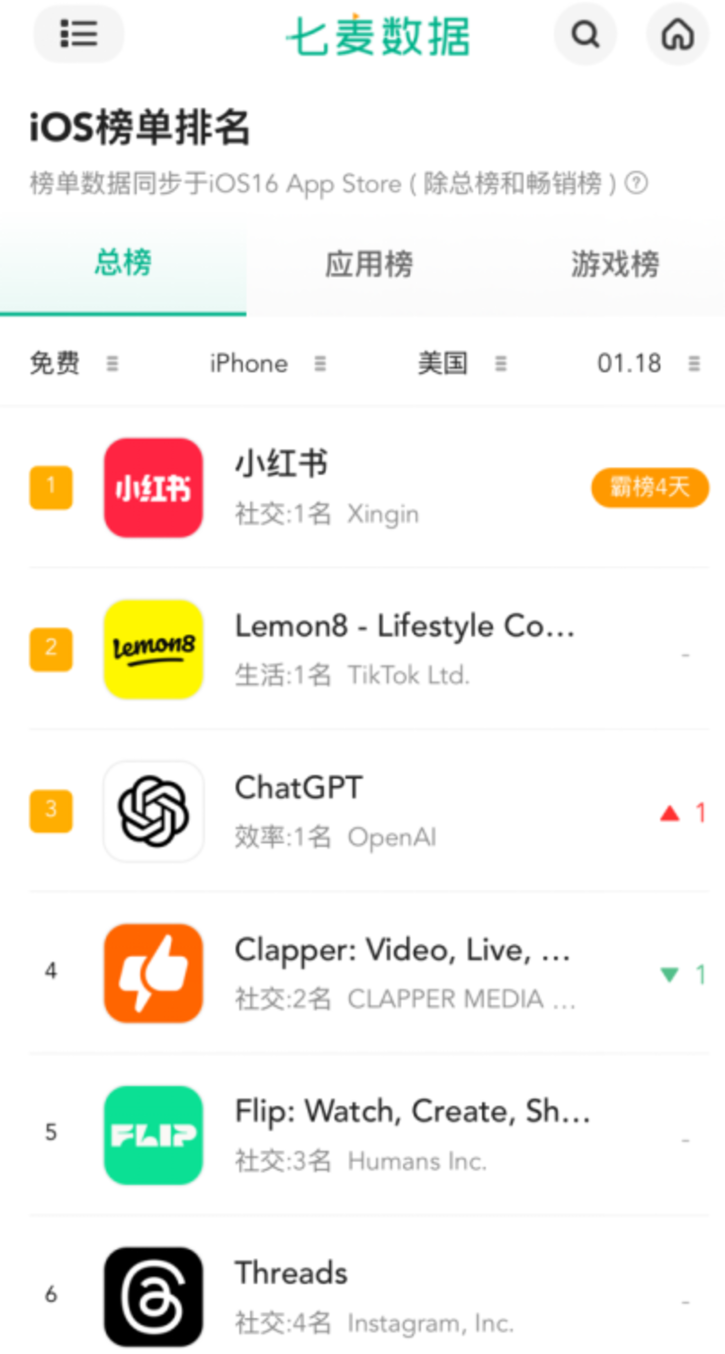 根据七麦数据,截至1月18日,iOS总榜单的前五名中,除了排名第三的ChatGPT是AI工具,其他都可以看作是“TikTok替代品”。