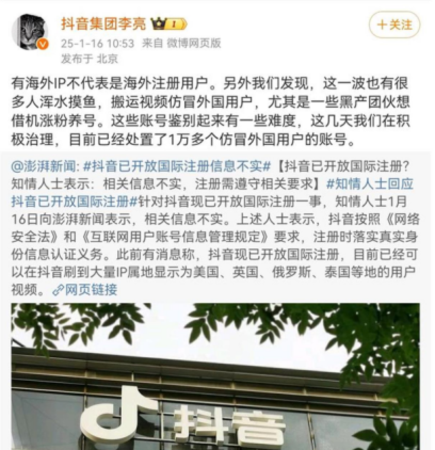 1月16日,抖音集团副总裁李亮亲自在微博上辟谣,称:“这几天我们在积极治理,目前已经处置了1万多个仿冒外国用户的账号。”