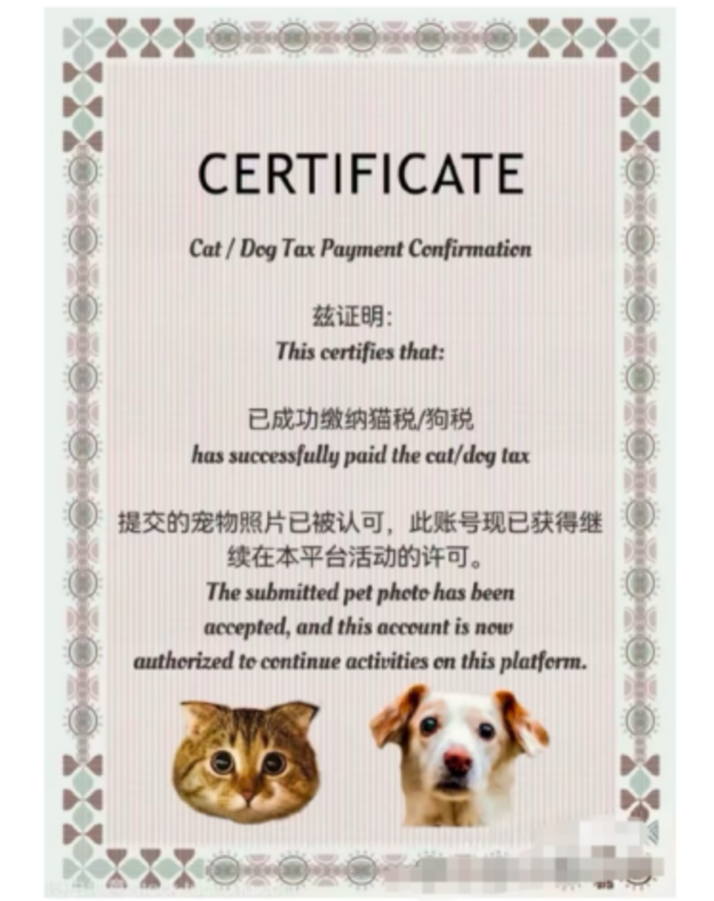 于是,在口口相传之中,“交猫税”成了不成文的准入门槛:传闻,小红书的用户很喜欢猫咪,发布猫咪照片,会被热烈欢迎。也确实如此,中国网民甚至制作了“缴税证明”,在评论区颁发。美国用户@OrangutanMoney在小红书发布自己抱着猫的照片,收获10万点赞和7.8万个评论,他向字母榜感慨:“实在让我大吃一惊,我原本预计最多只有25个赞,甚至可能一个都没有。”