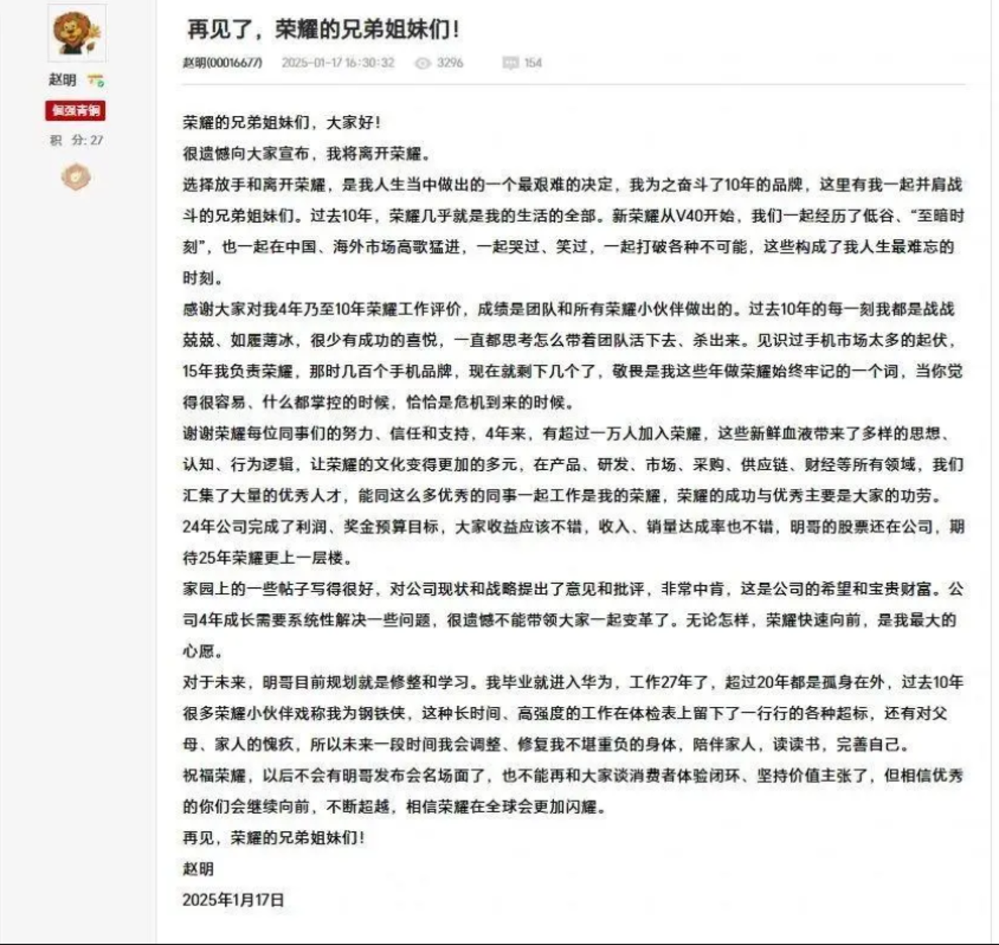 前途未卜的不止荣耀公司的命运,还有赵明的个人新航向。在发布的告别信中,赵明表示,对于未来,自己目前的规划是修整和学习,“陪伴家人,读读书,完善自己。”