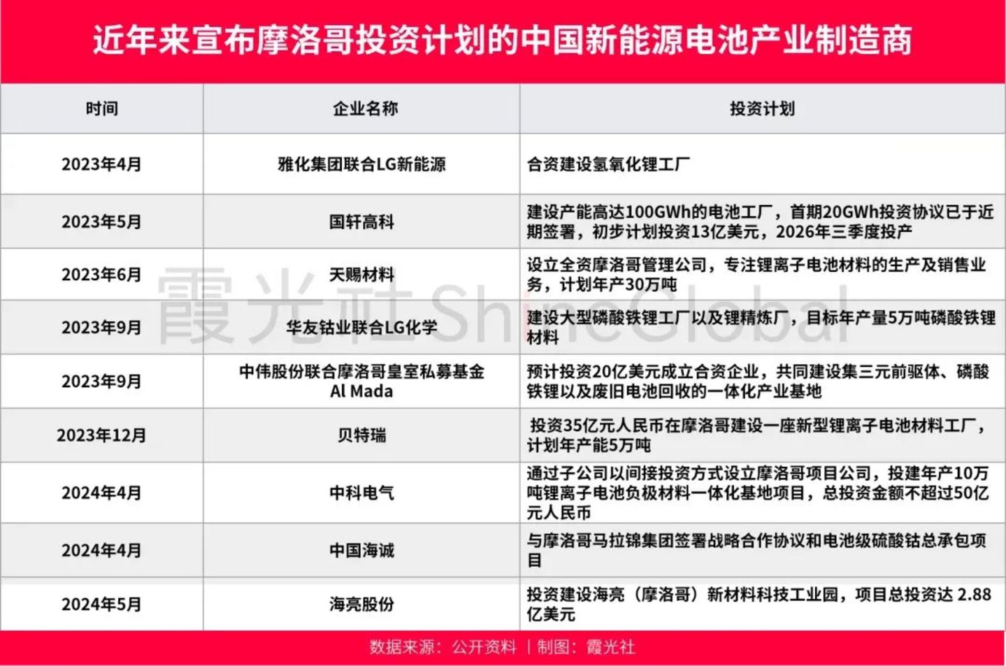 事实上,从2023年起,就有雅化集团、天赐材料、华友钴业等至少九家中国电池制造商在摩洛哥宣布了新的投资计划。