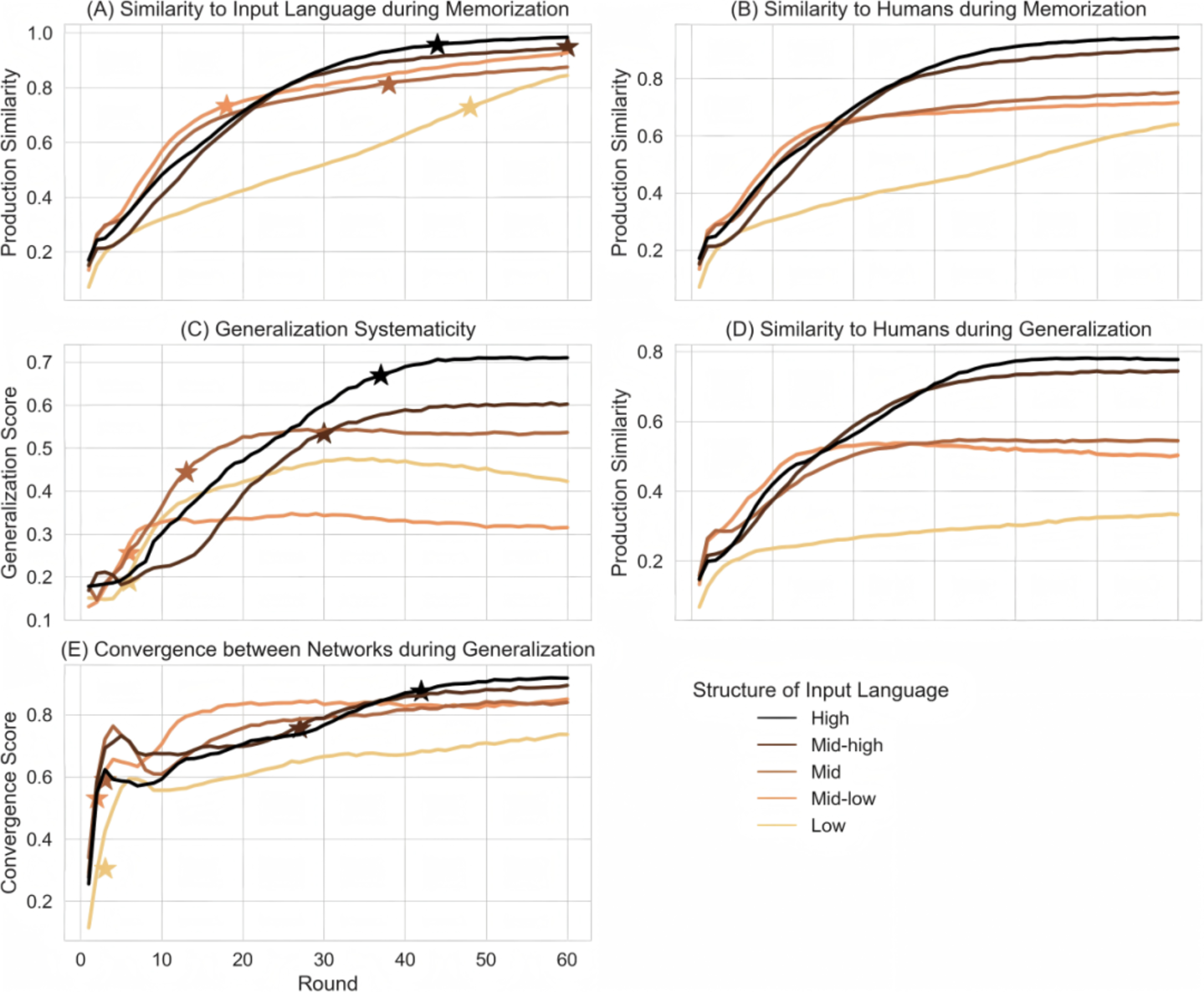 ▷ 图6. 展示了更结构化的语言如何导致更好和更快速的输入语言再生产(A)、对未知场景的更好泛化(C)、在记忆(B)和泛化(D)过程中与人类参与者的更高一致性,以及网络之间的更高收敛性(E)