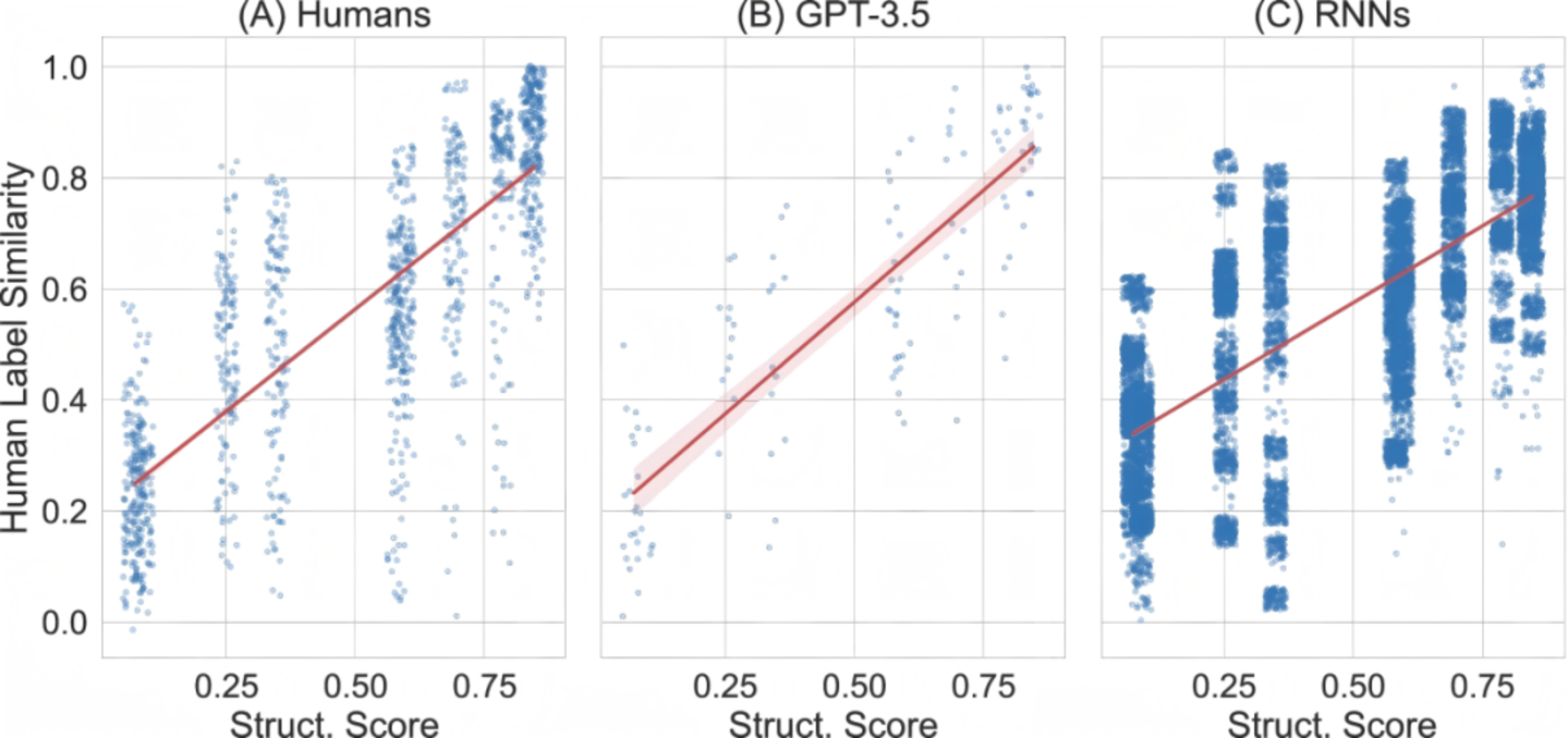 ▷ 图5. 展示了人类(A)、GPT-3.5(B)和RNN(C)在泛化过程中与人类生产相似性的最终得分。横轴表示输入语言的结构得分,纵轴表示生产相似性得分(计算为长度标准化的编辑距离),用于衡量模型生成的标签与人类参与者生成的标签之间的相似程度。