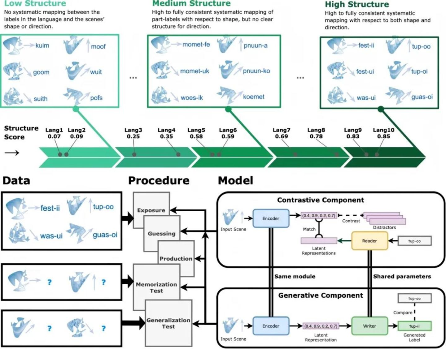 ▷ 图3. 实验设计概述。研究人员设计了不同结构程度的人工语言,分为低结构和高结构两类。低结构语言缺乏系统性和组合性,而高结构语言在形状和角度属性上都具有系统性和组合性。实验过程包括多个回合的训练,每个回合包含暴露阶段、猜测阶段和生成阶段。在每个回合结束后,研究者进行了记忆测试和泛化测试,分别评估模型对之前见过的项目的再生产能力和对新项目的生成能力。