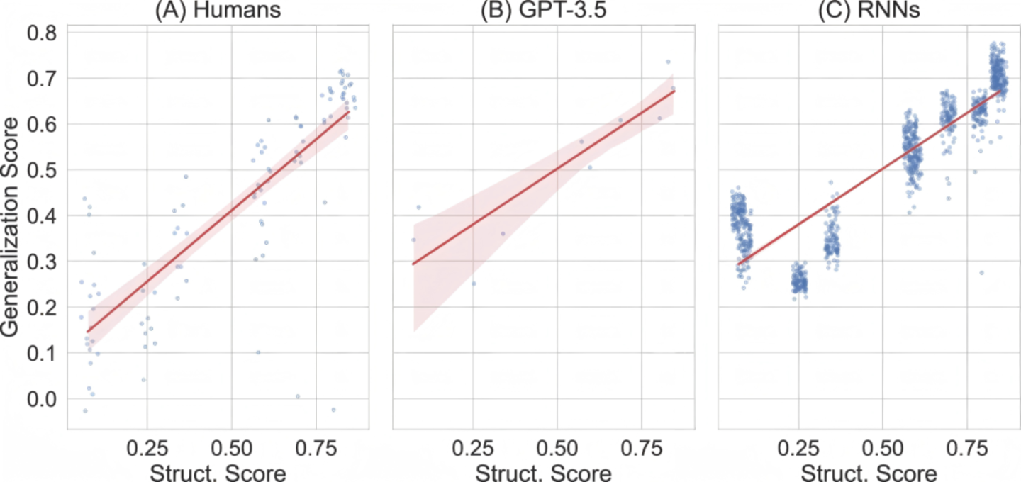 ▷图4. 显示了人类(A)、GPT-3.5(B)和RNN(C)在不同输入语言下最终达到的泛化得分。横轴表示输入语言的结构得分,纵轴表示泛化得分。每个点代表整个输入语言的泛化得分,反映学习者根据已学标签系统性地泛化新标签的程度。例如,如果学习者成功地将之前使用的部分重新组合,如将表示形状的“muif”和表示方向的“i”组合成“muif-i”,则泛化得分会很高。回归线的阴影区域表示通过自举法估计的95%置信区间。