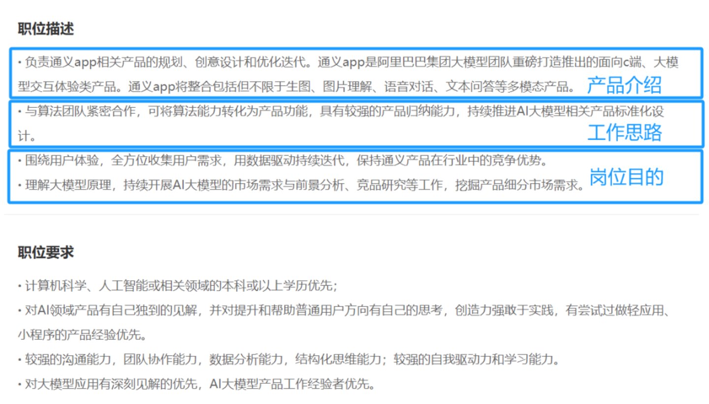 从通义app目前这唯一一个产品经理的岗位描述来看,其岗位的主要思路依然遵循技术本位,核心思路落在了“与算法团队紧密合作,将算法能力转化为产品功能”方面。