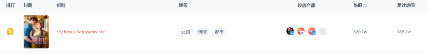 (根据ADX海外短剧版,《My Boss's Son Wants Me》累计热值超780W)