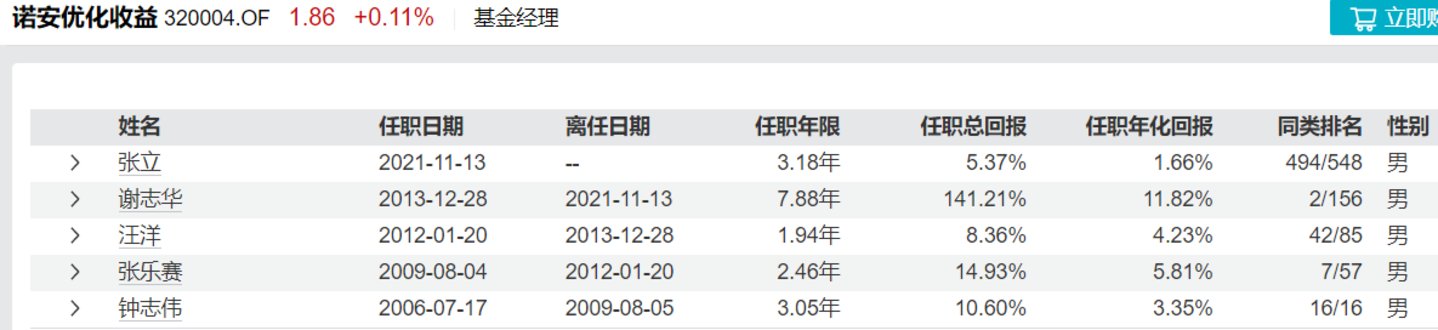 此外,公司研究室注意到,诺安基金的的张立,在管规模5.57亿,自2021.11.13担任诺安优化收益基金经理以来,任职总回报5.37%;此前管理这只基金的谢志华,任职年限7.88年,任职回报141.21%。