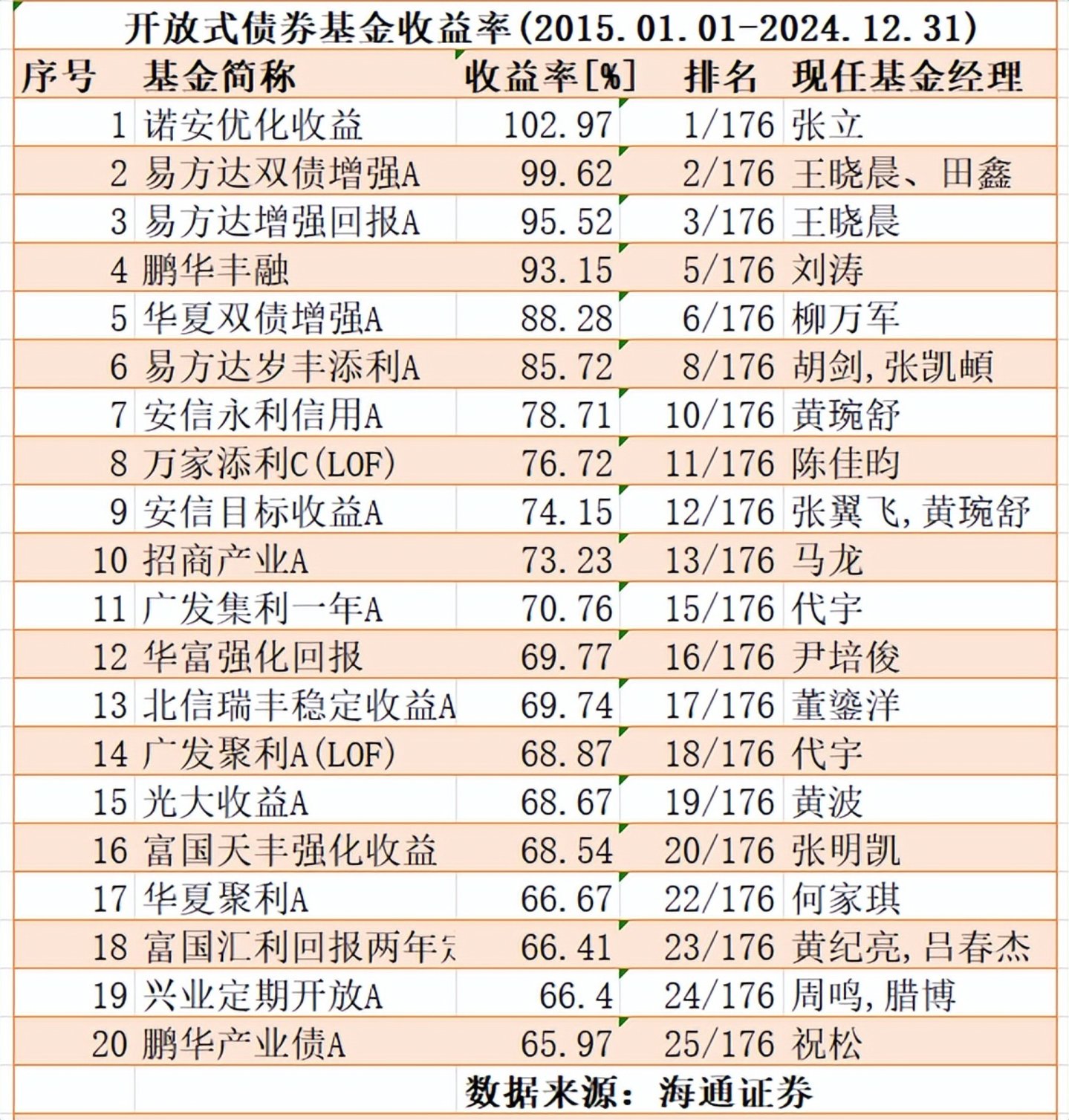 为此,公司研究室以海通证券的原始数据为基础,对开放式债券基金近10年(2015.01.01—2024.12.31,下同)收益率进行追踪,对业绩前20基金经理的投资风格做了回顾。