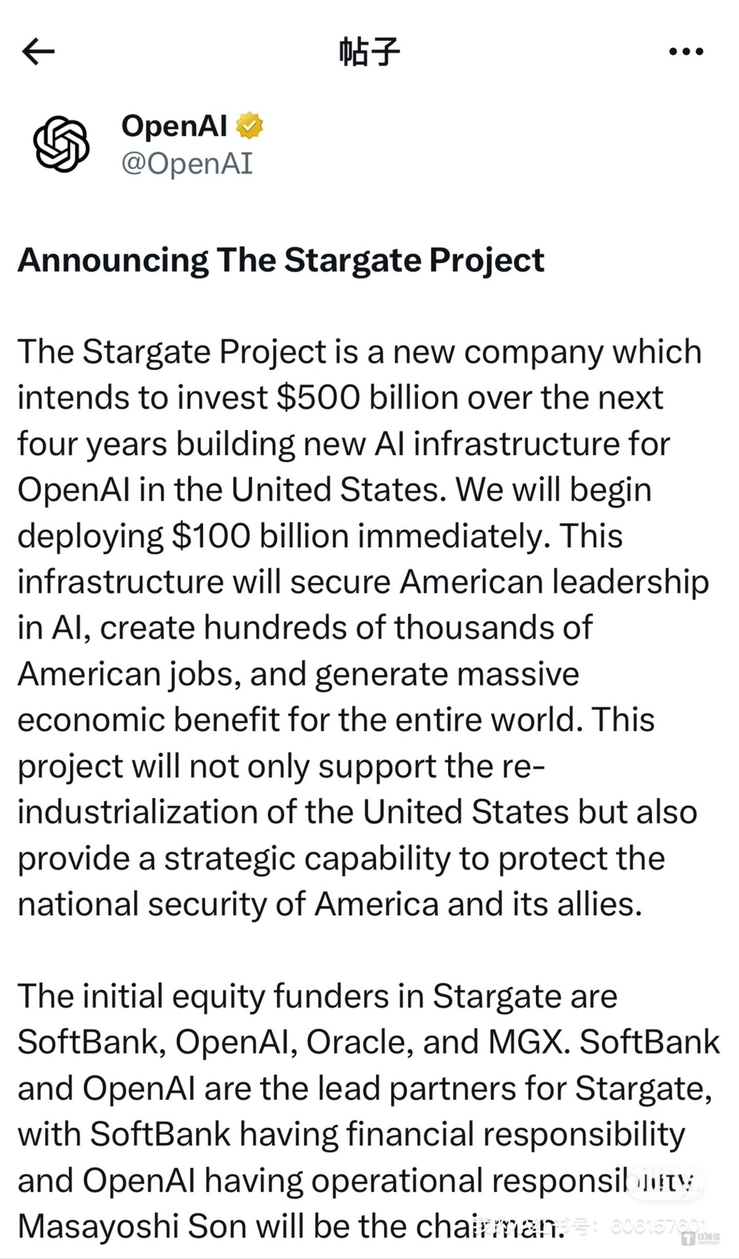 OpenAI表示,Stargate公司将立即开始部署1000亿美元,初始股权投资者包括软银、OpenAI、甲骨文和MGX。软银和OpenAI是星门计划的主要合作伙伴,软银负责财务,OpenAI负责运营,软银创始人孙正义将担任董事长。同时,Arm、微软、英伟达、甲骨文和OpenAI是关键的初始技术合作伙伴,AI基础设施建设已在德克萨斯州启动,并正在评估全国范围内的潜在地点,以建立更多园区;此外,作为计划的一部分,甲骨文、英伟达和OpenAI将紧密合作,共同建设和运营这一计算系统,且OpenAI将继续增加对微软Azure的使用,合作继续推进,利用这一额外的计算能力来训练领先的模型并提供出色的产品和服务。