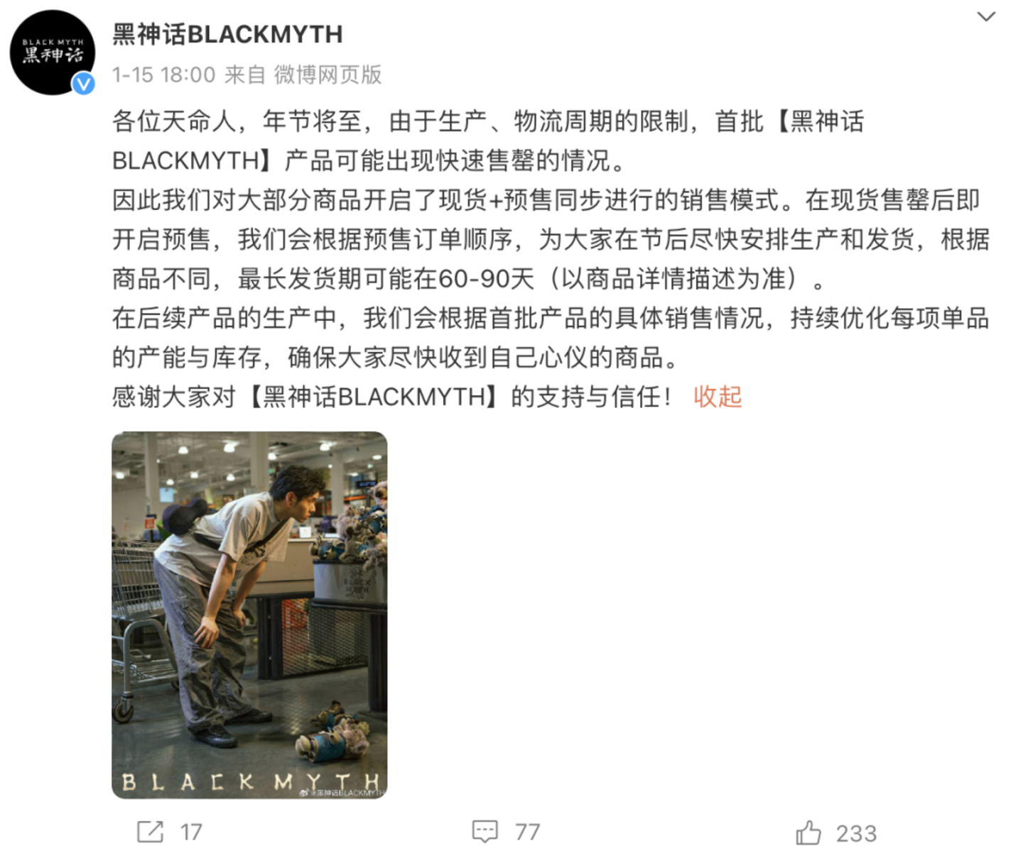 1月10号,《黑神话:悟空》也官宣将与阿里鱼、天猫潮玩达成战略合作,强化其在IP衍生品领域的品牌影响力。名创也好,阿里鱼也好,更多专业衍生品合作方的入局,也有望改善大量品控、定价和周期问题。