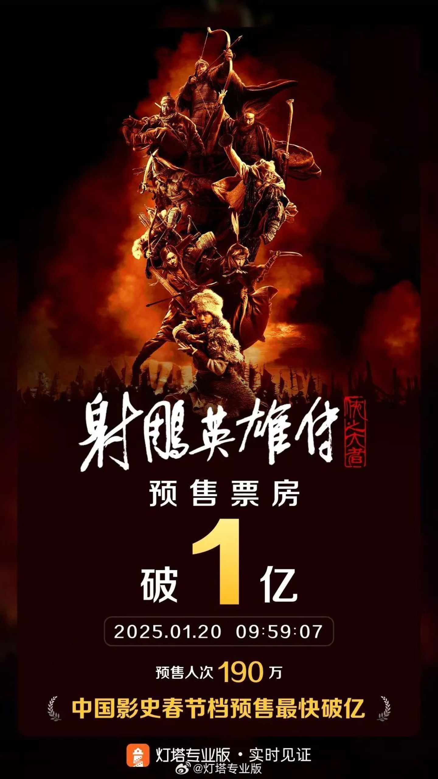 毫无疑问,这一战绩无论放在2025年春节档,还是整个中国影史上,都足以令市场侧目,预售开启45分钟票房破1000万、一个半小时破2000万、两个半小时破3000万......24小时破亿,截止发稿,《射雕》正在持续刷新着中国影史预售票房纪录。