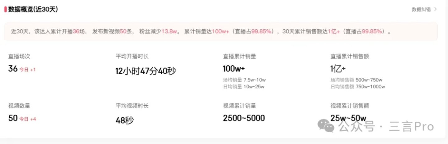 与辉同行近30天也是开播36场,平均开播时长13小时7分37秒,直播累计销量超100万,累计销售额超1亿,视频累计销售额2.5万-5万。