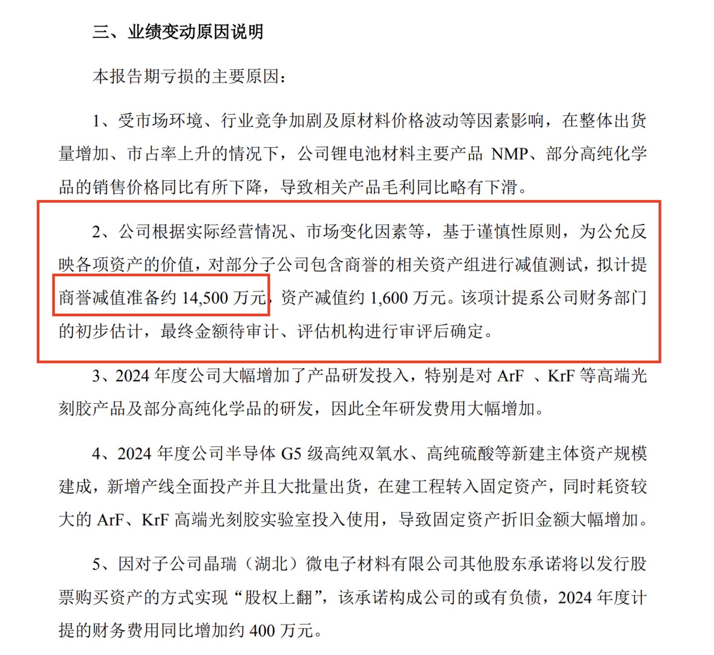 对于业绩下滑,晶瑞电材列出五个原因,可归为行业竞争加剧、计提减值影响、研发费用大增、折旧金额大增、财务费用增加五大类。其中,商誉减值可谓“灾难”级别,而且事发突然。