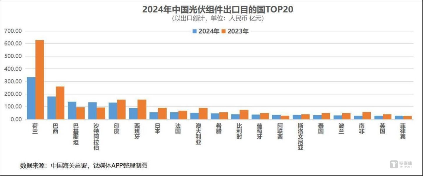 在光伏领域,这种热情体现得更为明显。钛媒体APP梳理海关进出口数据发现,2024年中国光伏组件出口至中东20余国的总额达到262.85亿元,同比增长23.4%,在光伏出口持续量增价减(2024年出口总额同比下降25.6%)的情况下,成绩尤显突出。其中,去年对沙特阿拉伯的组件出口额同比增长43.1%,达到134.74亿,首次实现对中东单一国家出口额突破百亿人民币;阿联酋依然是中东地区的“第二选择”,出口额同比增长28.3%,达到了36亿左右的水平;而我国组件在阿曼市场也迎来了大爆发,出口额暴增2.3倍,这一国家也从中东出口榜中的第9名跃升到了第3名。放眼全球,中东地区在中国光伏组件总出口额占比从2023年的8%涨到了去年的13.1%,是全球增幅最可观的区域市场。沙特阿拉伯从出口流向国的第6名进一步上升到了第4名,阿联酋一举提升10个位次跻身TOP20,阿曼更是从50名开外直接跃升到了第22名。而且,从TOP20国家的两年对比情况来看,只有中东的沙特阿拉伯、阿联酋和南亚的巴基斯坦、东南亚的菲律宾出口额有所增长,其他无论欧洲、南美、东亚或印度、澳大利亚、泰国,出口额均明显走低。