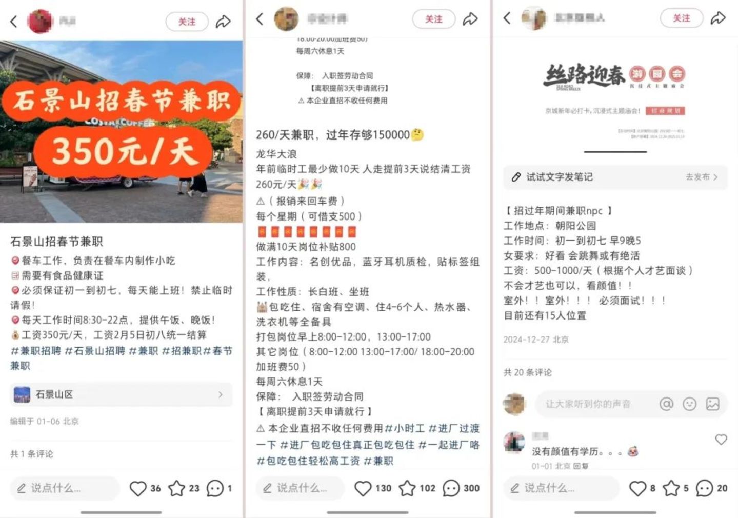 由于位置太远、没有时间面试、办健康证、时间对不上等各种原因,凯西目前仍处于观望的态度。关于春节零工的帖文中,那些“避雷”“骗子”“中介”等字眼,也有点让凯西打退堂鼓。
