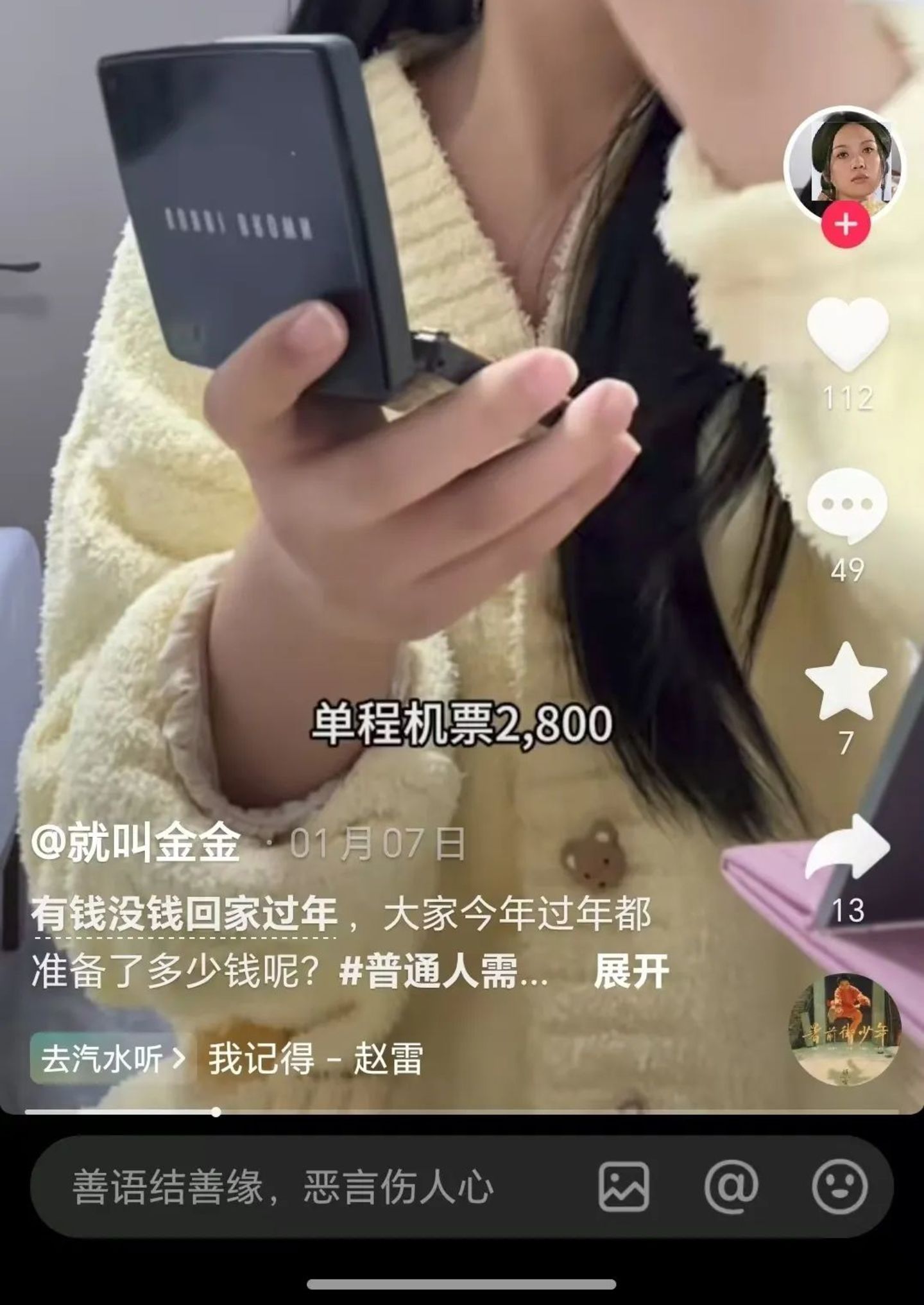 视频一出,引发不少归家打工人的共鸣。在这条视频评论区,一些声音表示跃跃欲试,也想算算过年这笔帐,同时也有不少人表达出了自己的无奈,“一年到头存不下来钱不说,最后一个月花销还大”。