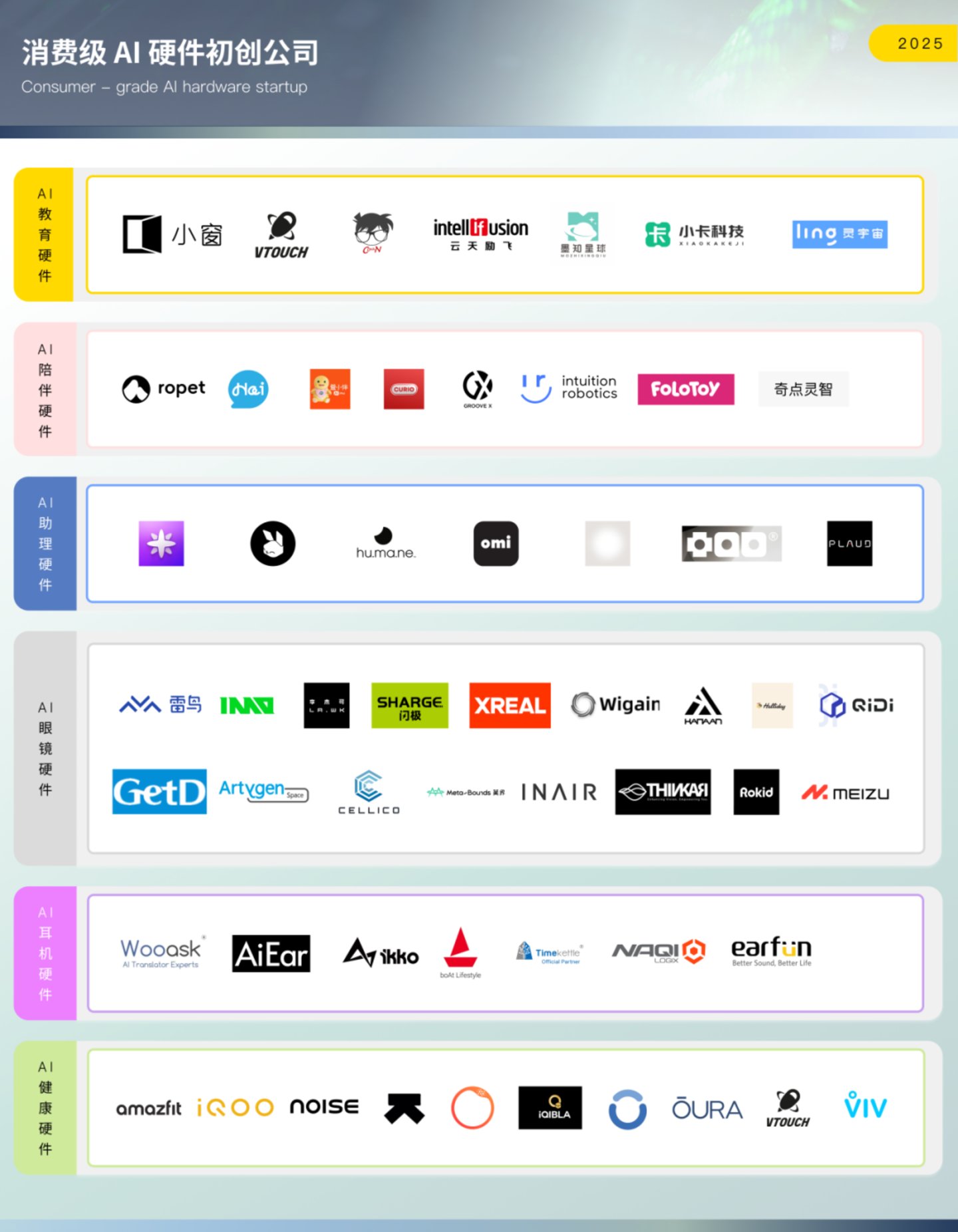 2025年初,在AI大模型和AI应用热潮之后,消费级AI硬件也开始逐步受到市场和资本的关注,除了手机和PC外,AI也确实正在改变消费电子产品的外延和形态。截至目前,我们统计至少已有117家公司入局了AI硬件。这些硬件产品主要集中在眼镜、耳机、教育、陪伴、助理和健康六大领域,其中有超7成为中国公司,除中国之外,美、日、韩、印、以色列企业均有参与。