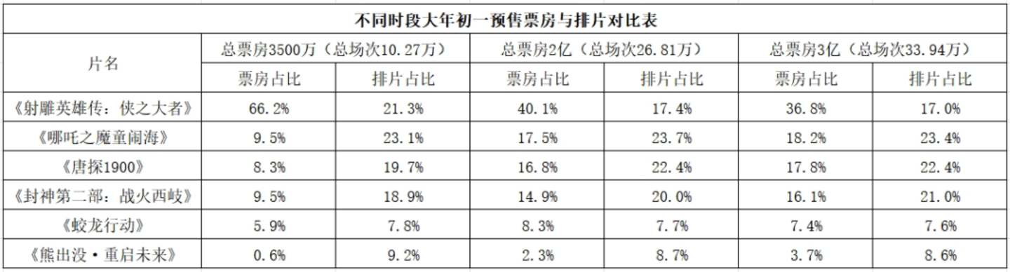 粉丝购票辛苦冲击预售,为的就是在影片上映前期能争取到更多排片,为影片之后的竞争形势铺好路。只可惜从目前的结果来看,预售作用于实际排片的效果甚微。毒眸统计了大年初一大盘抵达阶段性节点时各影片的票房占比与排片占比变化情况,结果显示,随着开场增多,《射雕》的排片占比进一步萎缩,《哪吒》《唐探1900》相对稳定,《封神》稳步走高,《蛟龙行动》与《熊出没》略微下滑。