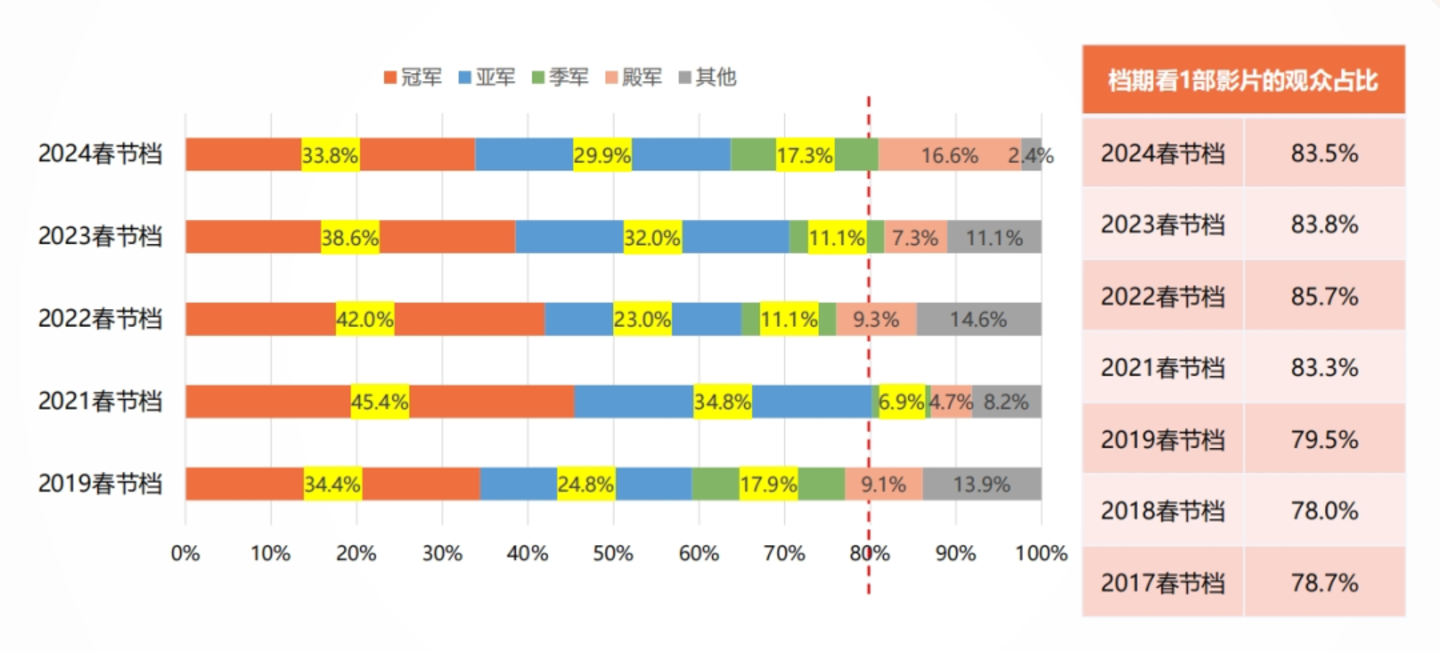 大片齐出的利好在于,今年或许有机会撬动更多观众观看两部电影。往年春节档的绝大部分观众仅选择一部电影,这也是票房集中度偏高的核心原因。有了这样的前提,春节档影片的竞争就更像一场零和博弈,只有当观众拥有反复走进影院的可能时,才能美美与共,并抬高档期整体的天花板。