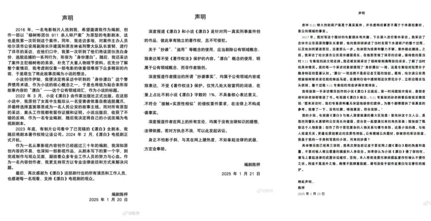 除了王猛与陈枰之间的交锋,1月22日晚间,《漂白》剧组也就此事作出回应,称电视剧《漂白》的影视剧改编权购买自陈枰同名小说,并委托陈枰进行剧本改编工作,根据双方签署的相关合同约定,陈枰应负责保证原著小说及剧本内容合法合规,且不侵犯任何第三方权益,如因此产生任何争议纠纷,由陈枰承担相应责任。