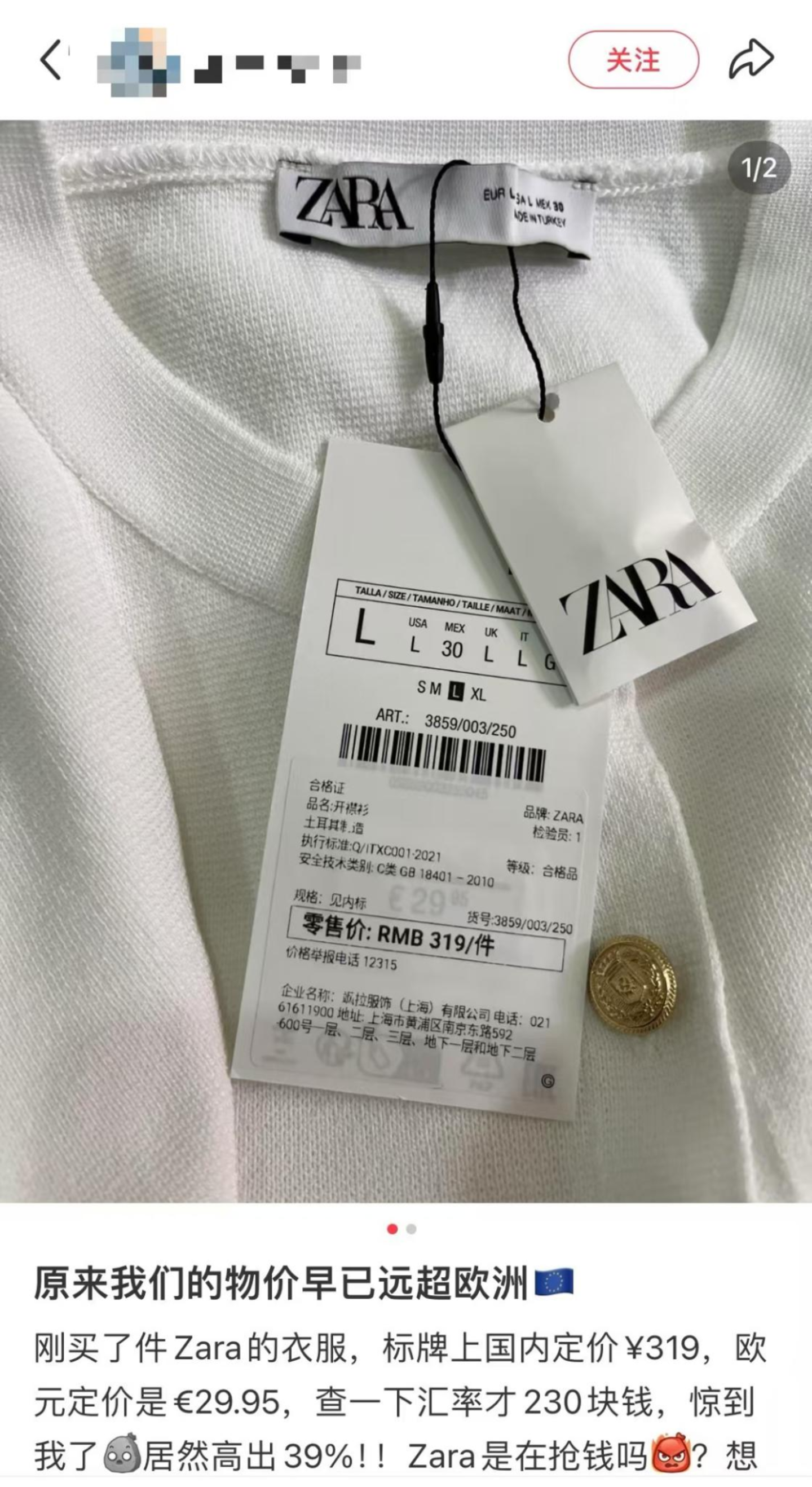 一方面,是消费大环境不振,人们对于价格愈发敏感。有网友在小红书上吐槽买一件ZARA衣服,国内定价319元,欧洲定价则为29.95欧元,换算过来就是230元,差价高达89元。