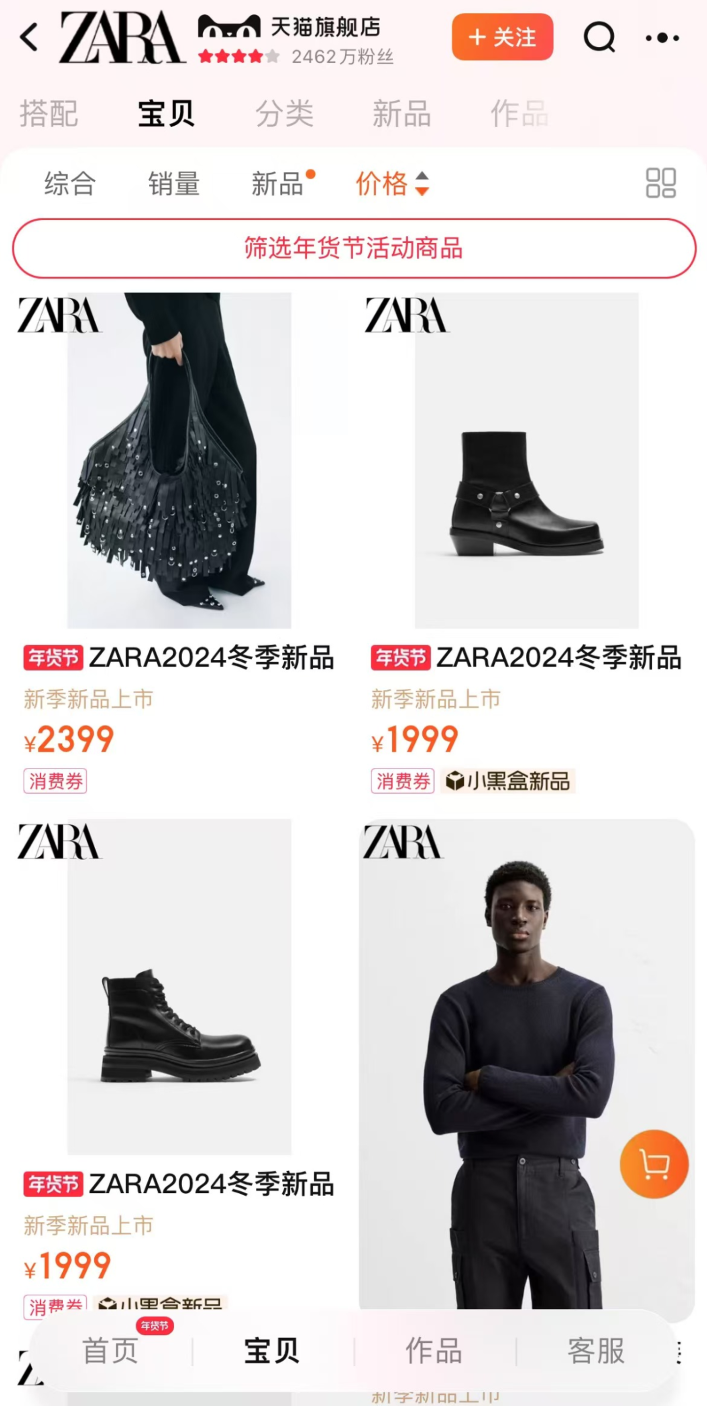 打开ZARA的天猫旗舰店也可以发现ZARA在产品宽度上的拓展。2024年冬季新品中,有价格高达2399元的托特包,和1999元价格带的毛衣、外套、鞋子等产品。