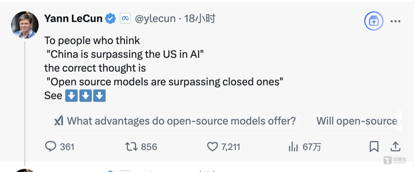 正如图灵奖得主、Meta AI首席科学家杨立昆(Yann LeCun)所说,“给那些看到 DeepSeek 的表现后,觉得‘中国在 AI 方面正在超越美国’的人,你们的解读是错的。正确的解读应该是,‘开源模型正在超越专有模型’。”