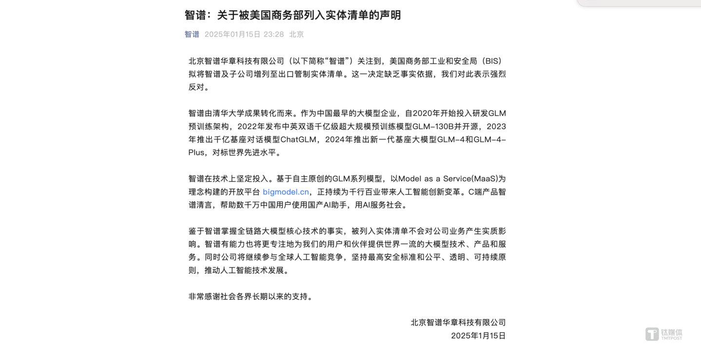 对此,智谱发声明回应称,“美国商务部工业和安全局(BIS)拟将智谱及子公司增列至出口管制实体清单。这一决定缺乏事实依据,我们对此表示强烈反对。鉴于智谱掌握全链路大模型核心技术的事实,被列入实体清单不会对公司业务产生实质影响。智谱有能力也将更专注地为我们的用户和伙伴提供世界一流的大模型技术、产品和服务。同时公司将继续参与全球人工智能竞争,坚持最高安全标准和公平、透明、可持续原则,推动人工智能技术发展。”