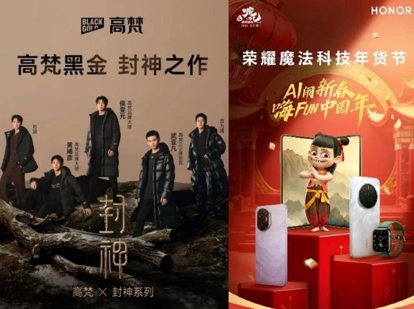 如手机品牌荣耀押宝《哪吒之魔童闹海》,在线上推出了魔法锁屏、“哪吒主题”定制联名特效活动和联名礼盒,打造“荣耀魔法科技年货节”,线下门店也开设了打卡专区。《封神 2》由于其史诗气质和高概念设定,获得不少走品质、高端路线的品牌青睐,如高梵推出了联名黑金羽绒服,还邀请了侯雯元、黄曦彦、武亚凡等片中演员拍摄宣传硬照并担任品牌大使、体验官等角色。