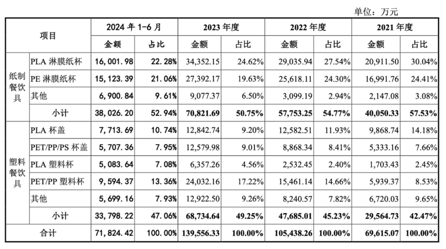 这还是面向消费端的价格,恒鑫生活的出货价则更低。招股书显示,2024年上半年,其主要产品为PLA塑料杯、PET/PP塑料杯、PLA淋膜纸杯、PE淋膜纸杯、PLA杯盖、PET/PP/PS杯盖,批发价分别为0.57元、0.27元、0.22元、0.19元、0.16元、0.08元。