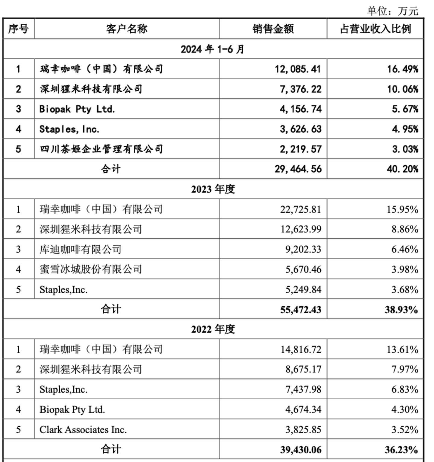 这些茶咖巨头们给恒鑫生活带来的订单量,无疑是更巨大的。恒鑫生活招股书显示,2024年上半年,第一大客户瑞幸给其贡献约1.2亿元销售额,喜茶旗下供应链公司深圳猩米科技、霸王茶姬分别贡献约7376万元、2219万元销售额。另在2023年,库迪、蜜雪冰城也带来约9202万元、5670万元销售额。