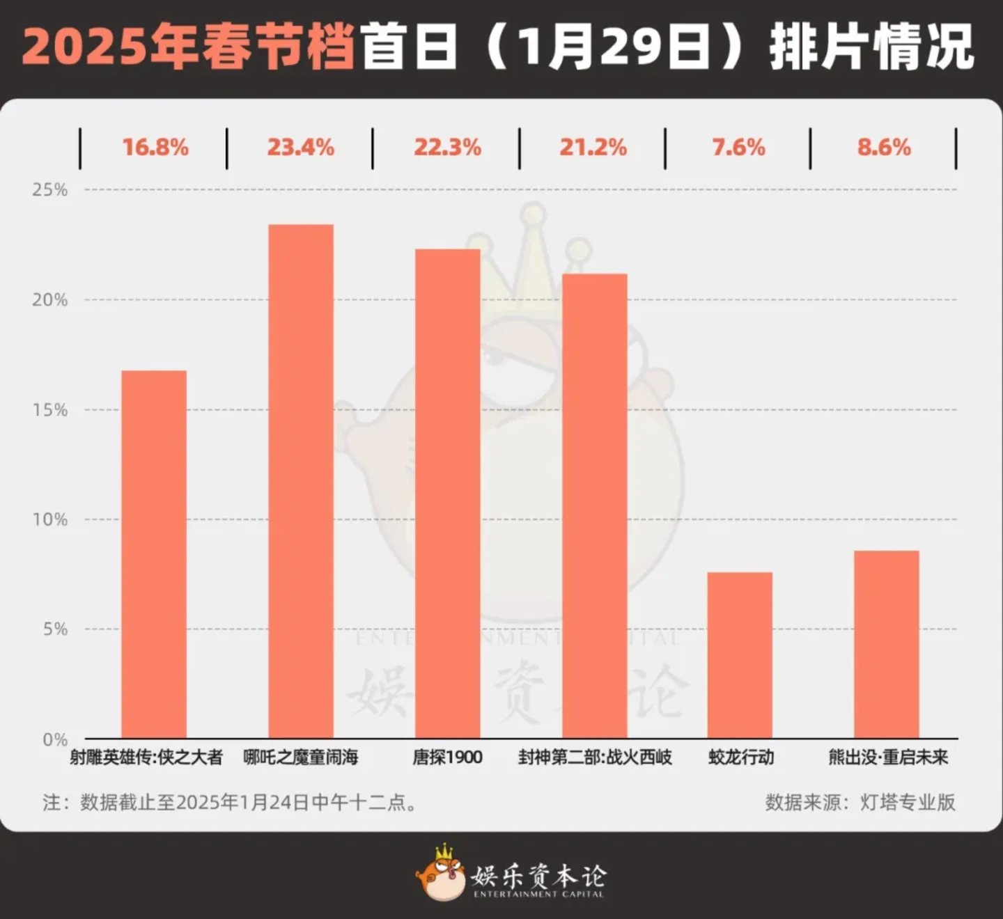 图6 2025年春节档首日(1月29日)排片情况 注:数据截止至2025年1月24日中午十二点。