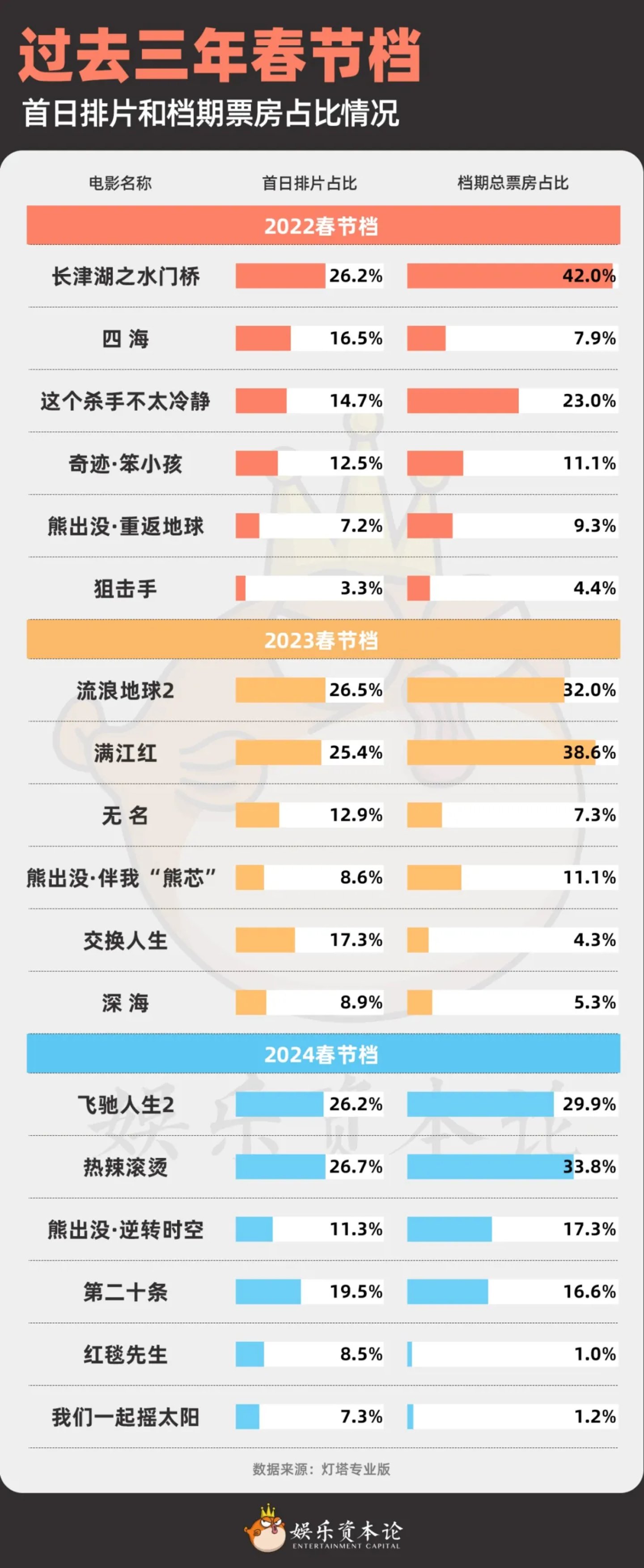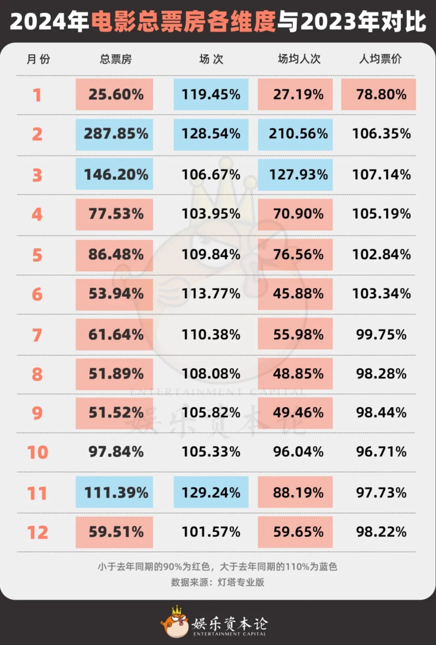 图1 2024年电影总票房各维度与2023年对比 数据来源:灯塔专业版。下同。