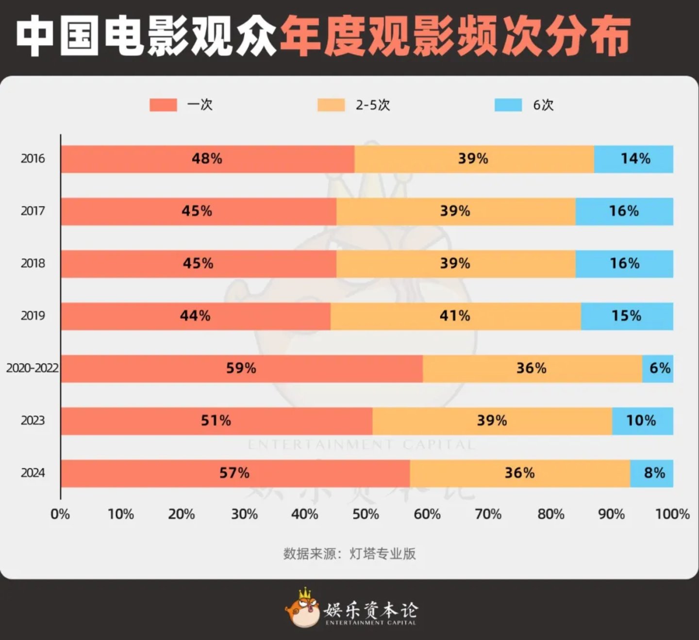 “淡季”作品对观众的吸引力下降,最直接导致的结果是观影频次的下降。对比2023年,2024年的中高频观影人数急剧萎缩,一年只进一次电影院的观众大幅提升。