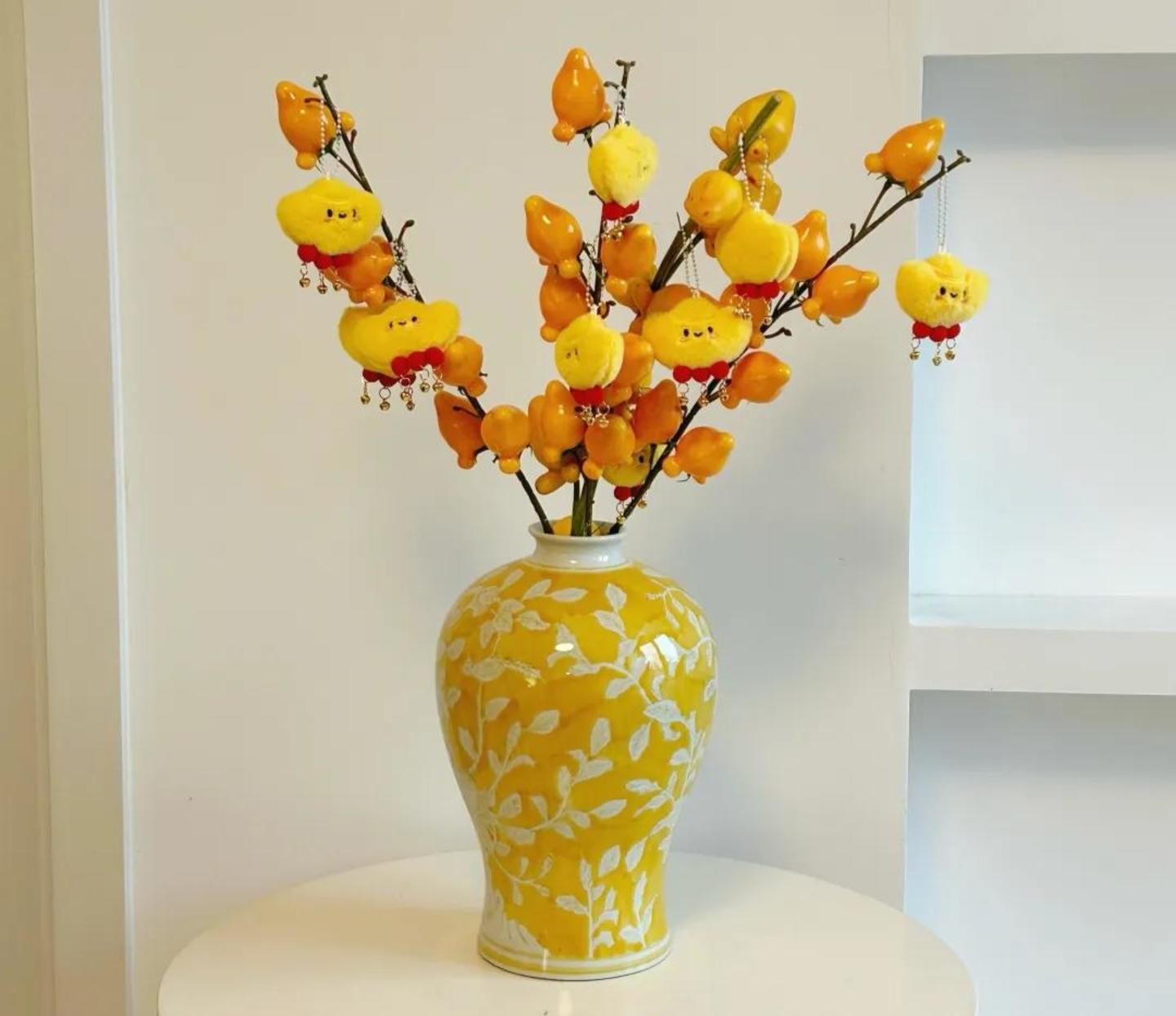 ● 黄金果花瓶“富贵花财”,搭配黄金果和发财元宝。图源:社交媒体