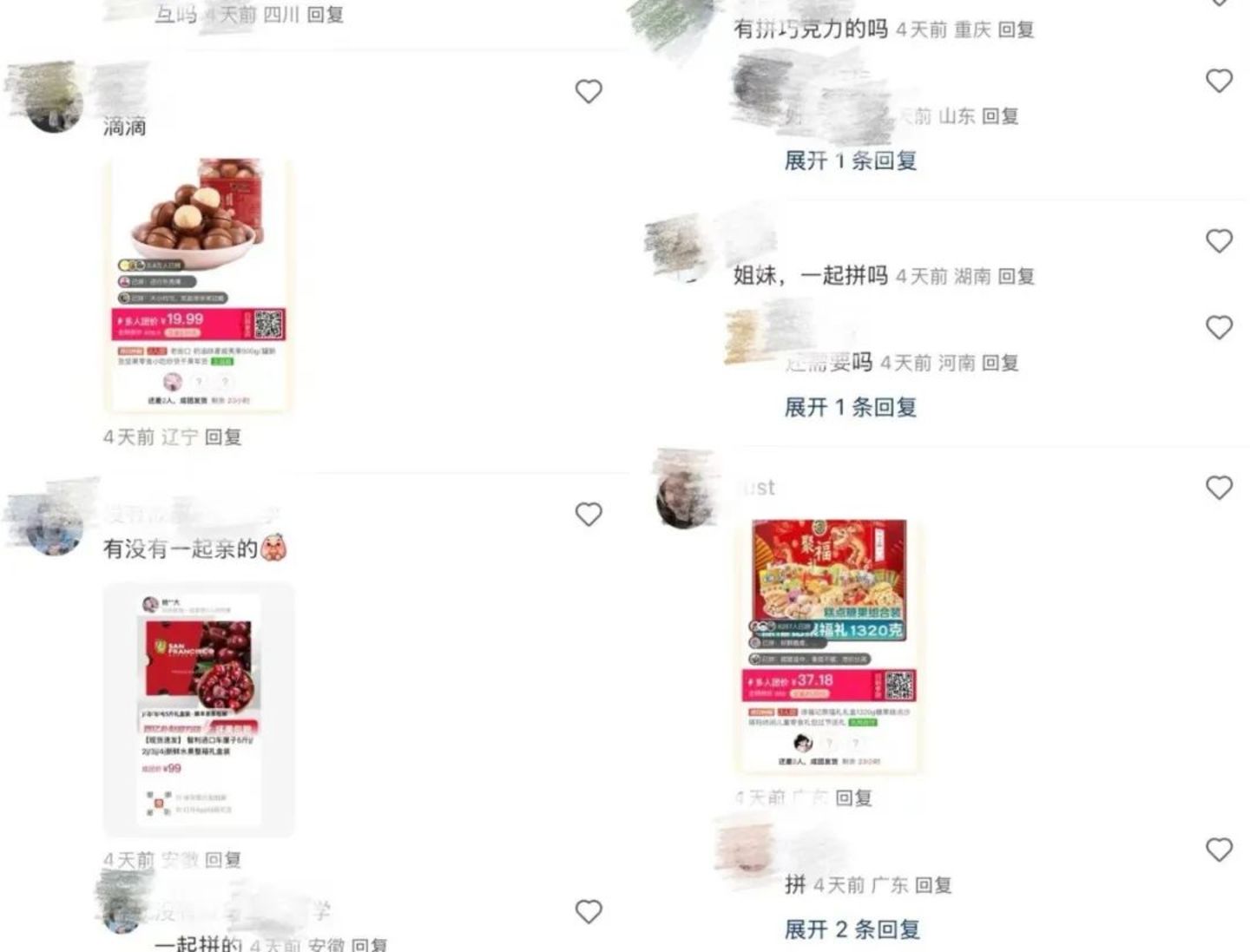 灵机一动的橘妈,在社交平台发起了拼单群,没想到有不少姐妹求入群。还有不少网友在橘妈的评论区发帖不同年货拼单商品,包括零食糖果组合、水果礼盒等等。