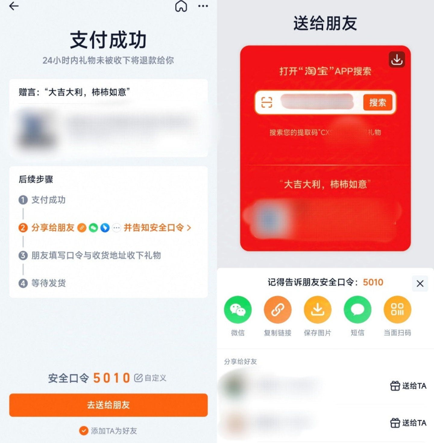 淘宝用户只要搜索对应商品,就能在商品页位置看见“送给朋友”的入口,完成付款会生成一个安全口令,用户便可直接发送给朋友。虽然也能分享到微信,但目前淘宝送礼物功能转发给微信好友,还是只能通过复制链接的方式分享,受赠人需要需要输入安全口令才能领取。