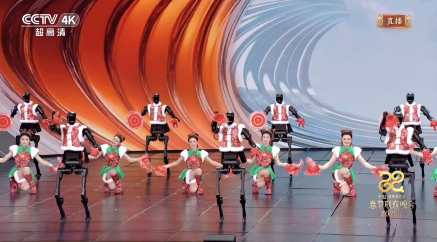 这群身穿小红袄的“机械小可爱”来自杭州宇树科技,擅长精准舞蹈的H1机器人,自2023年发布以来,已在北京世界机器人大会、英伟达GTC大会、张艺谋导演的《澳门2049》舞台剧等国际顶级活动中亮相。而这次登上春晚,是它们最大规模的一次全AI驱动自动化集群演出。