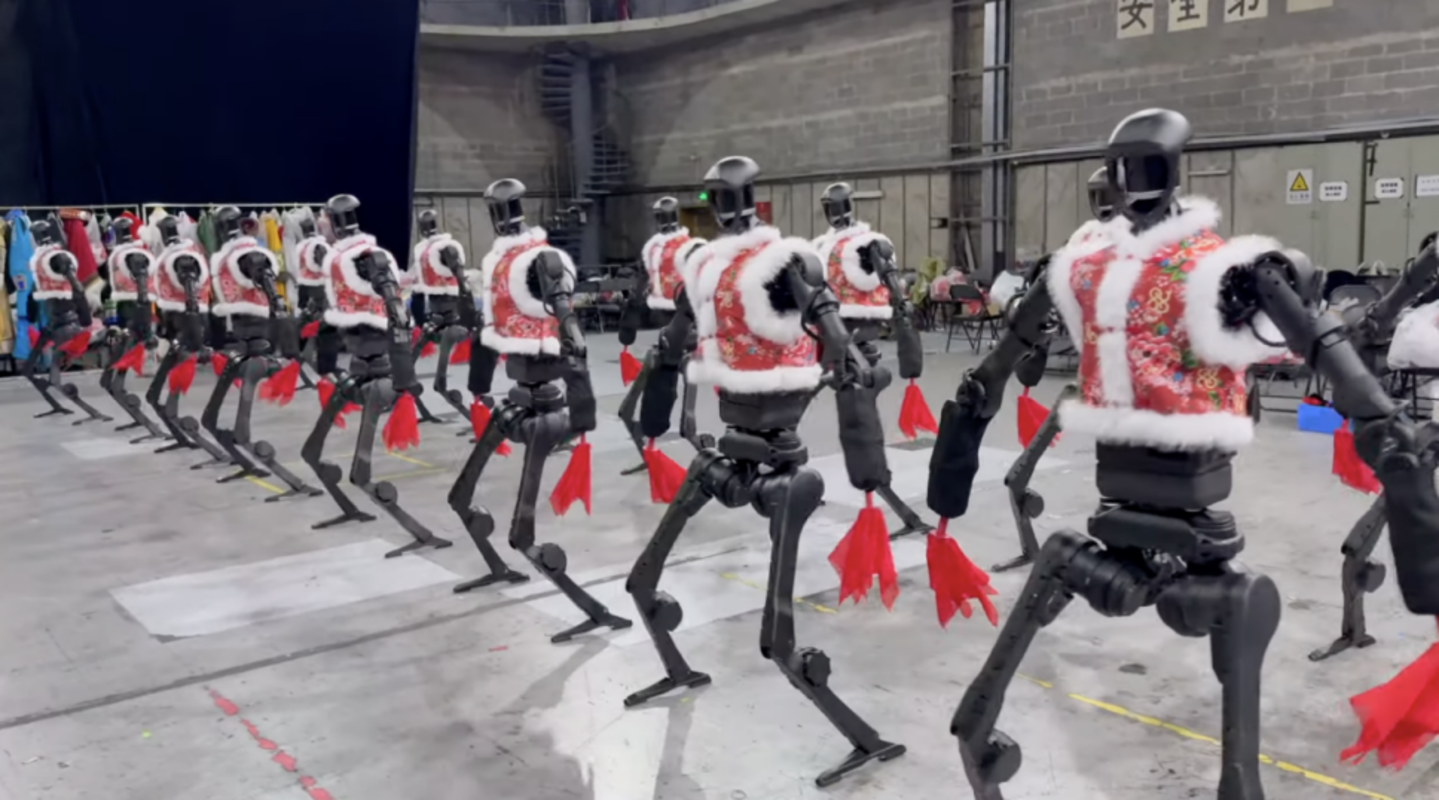 宇树科技解释,这种机械化的外形与柔美的人类舞者形成强烈视觉对比,使整个演出更具未来感和戏剧张力。赛博朋克风格的机械舞者与传统秧歌舞蹈的融合,创造了一种别具一格的美学冲击,让这场表演不仅仅是一支舞,更像是一场关于人机共舞未来世界的探索。
