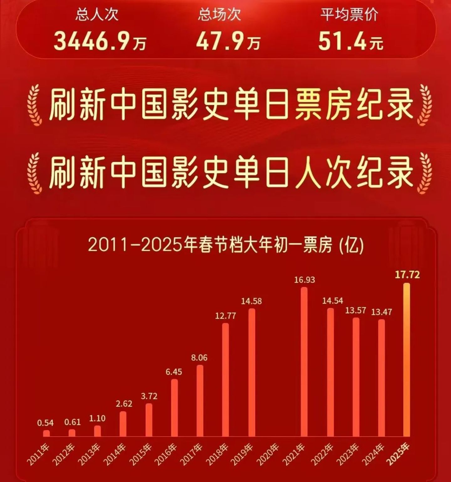 猫眼专业版显示,截至1月29日21时41分,2025大年初一票房超17.72亿,刷新中国影史单日票房纪录,观影人次超3446.9万,刷新中国影史单日观影人次纪录。