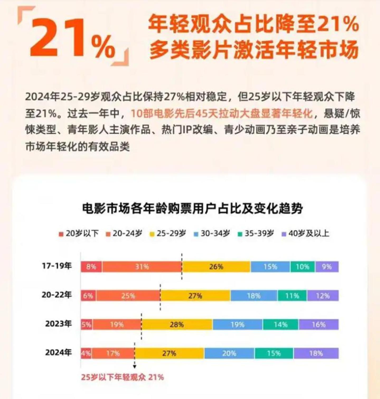 灯塔研究院在2025年1月1日发布的《2024中国电影市场年度盘点报告》显示,2024年有近六成观众全年只进过一次电影院,而且年轻观众的流失远比想象中更严重:25-29岁观众占比保持27%,相对稳定,但25岁以下年轻观众占比降至21%。