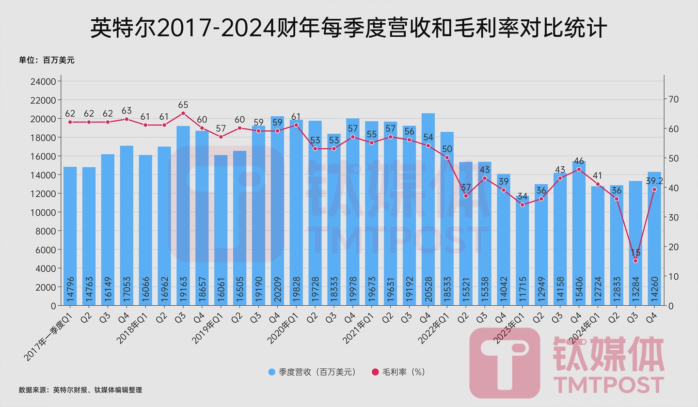 据钛媒体AGI编辑整理,自2022年之后,英特尔季度业绩出现明显下降迹象,整体业绩不佳,营收和毛利率都显著下滑,毛利率从2017年的60%以上,降低到2024财年的35%左右,Q3毛利率甚至降低到15%。