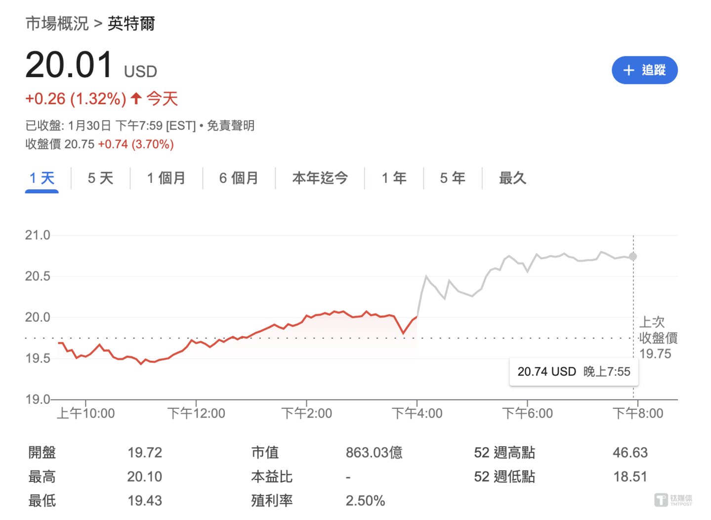 受到财务业绩影响,英特尔周四盘后涨3.70%,报收20.75美元/股,最新市值863.03亿美元,过去12个月里,英特尔股价跌幅达53.55%。