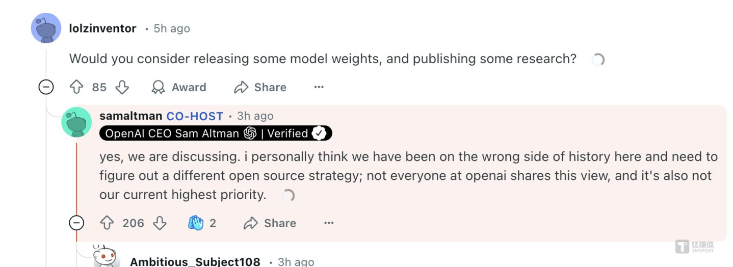 “是的,我们在讨论。我个人认为我们在某些方面可能站错了历史的一边,需要找出不同的开源策略;并不是所有来自OpenAI的人都持有这种观点,这也不是我们当前的最高优先事项。”