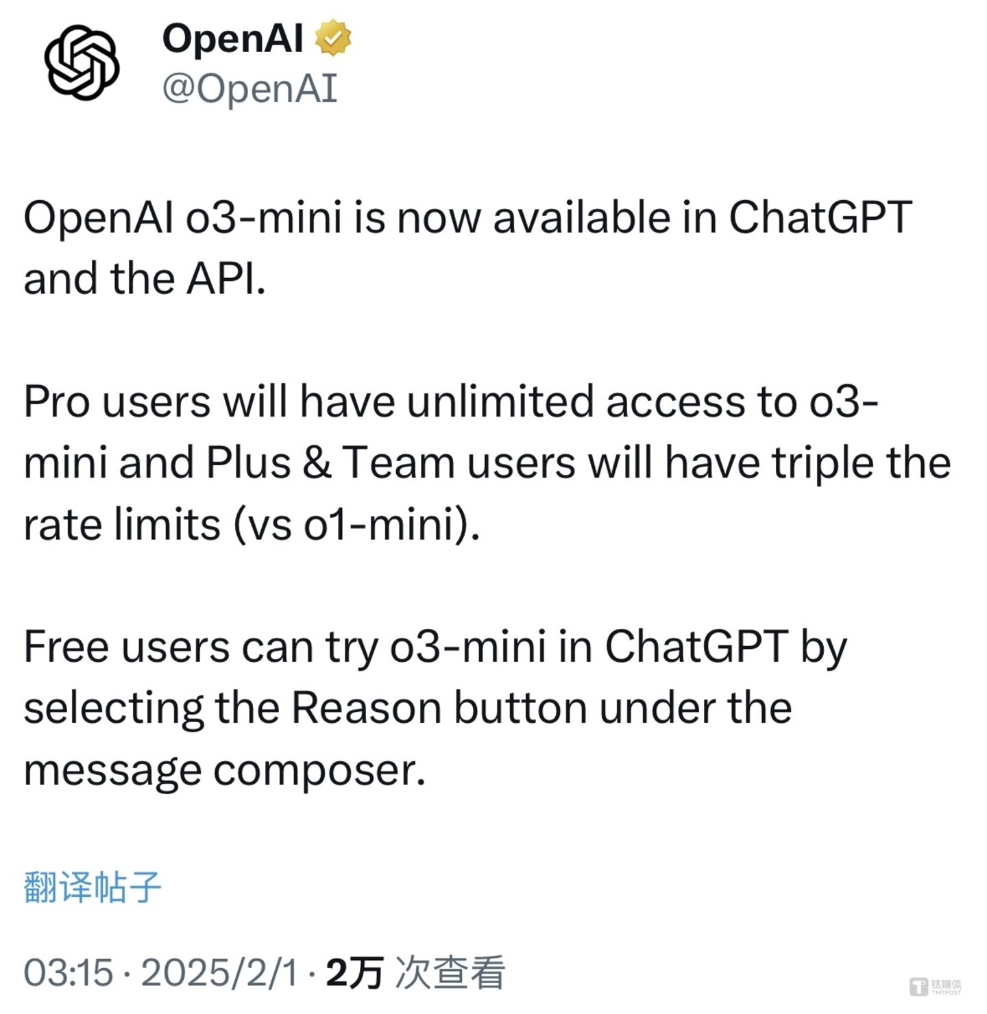 今晨发布的o3-mini模型,主要包括高、中、低三个版本,没有思考技术——奥尔特曼称将很快上线。