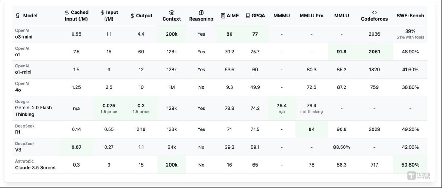 在价格、性能等层面,o3-mini是目前OpenAI性价比最高的模型之一,多项技术能力超越了DeepSeek R1(从上图看)。