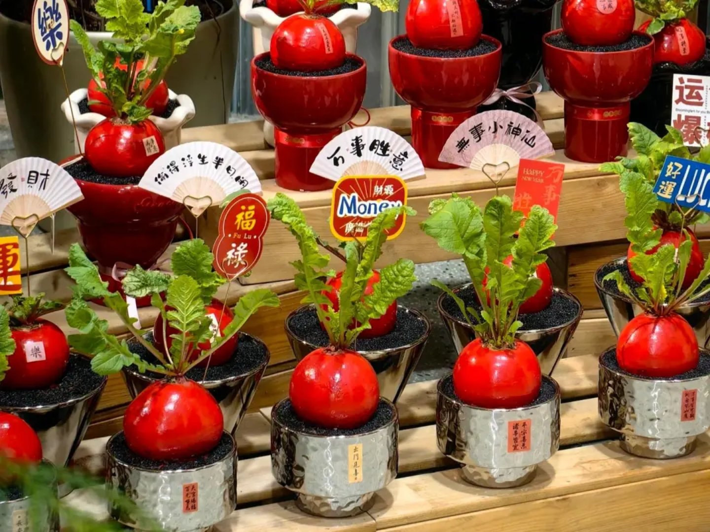 现在,作为年宵花的红皮萝卜,不仅被洗得干干净净,有了自己的精致小瓷盆独居单间,还被贴上了各种吉祥挂饰,就连身价也翻了20—50倍——在不同地区和花店里,一盆红皮萝卜年宵花,售价能达到28—100元。