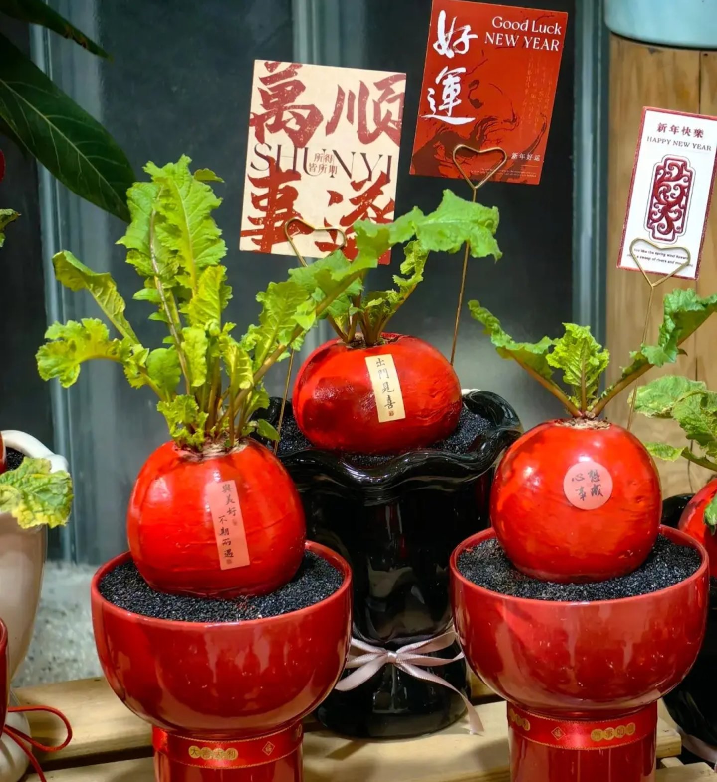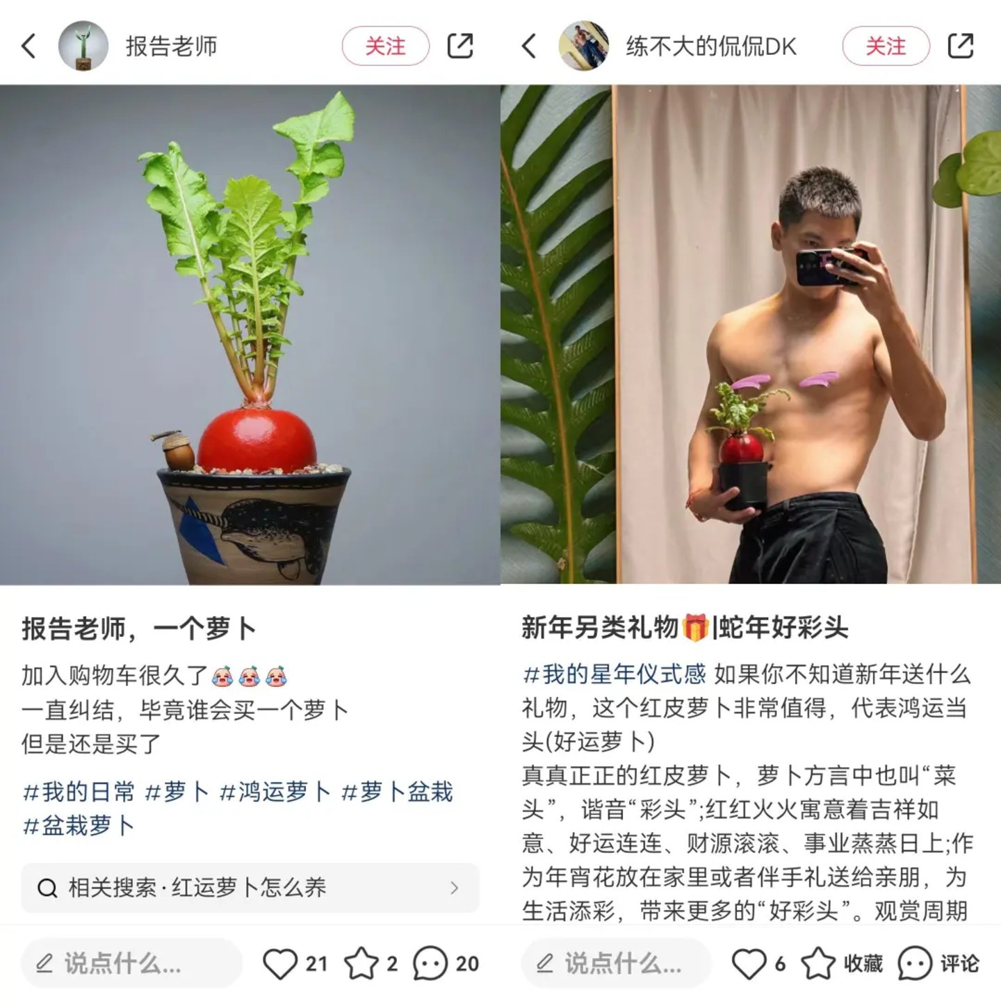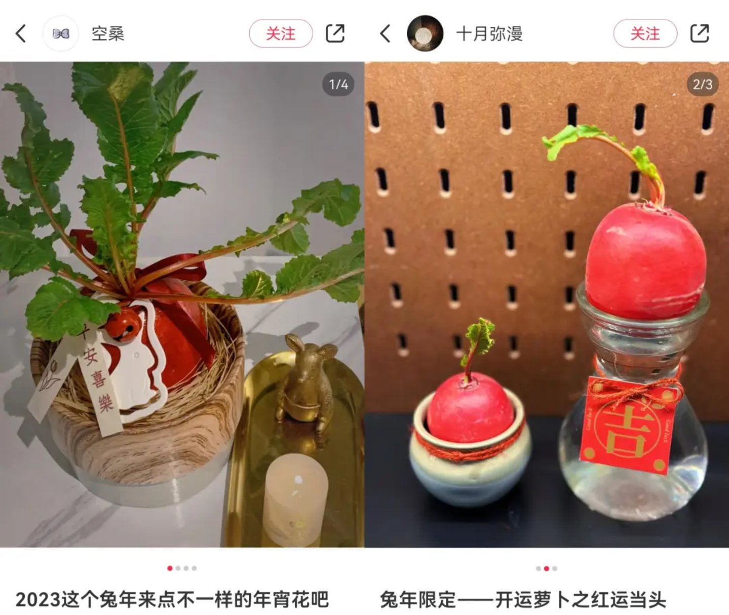 小红书上,有无数年轻人晒出了自己的红皮萝卜盆栽,带着它们融入春节的喜庆氛围中,还向所有人推荐着这款盆栽。