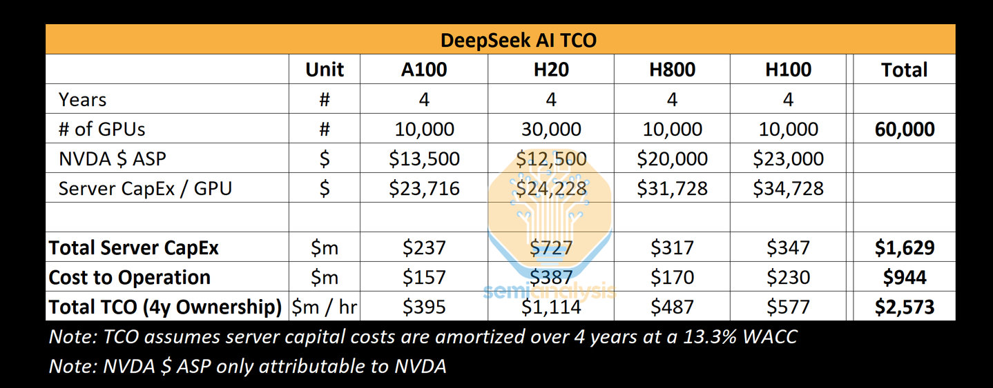 而说到不包括与架构、算法或数据方面的先前研究和实验相关的所有其它成本,据媒体报道,2019年,推出DeepSeek的幻方量化成立AI公司,其自研的深度学习训练平台“萤火一号”总投资近2亿元,搭载了1100张GPU;两年后,“萤火二号”的投入增加到10亿元,搭载了约1万张英伟达A100显卡。